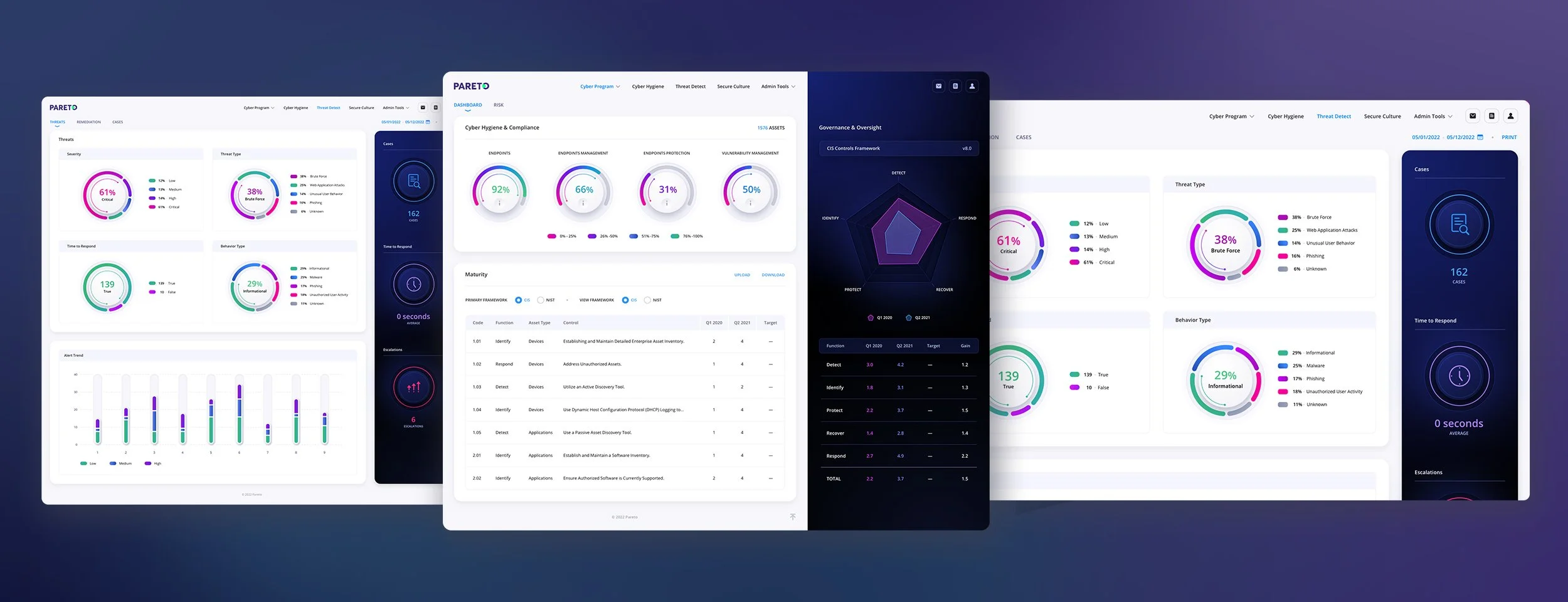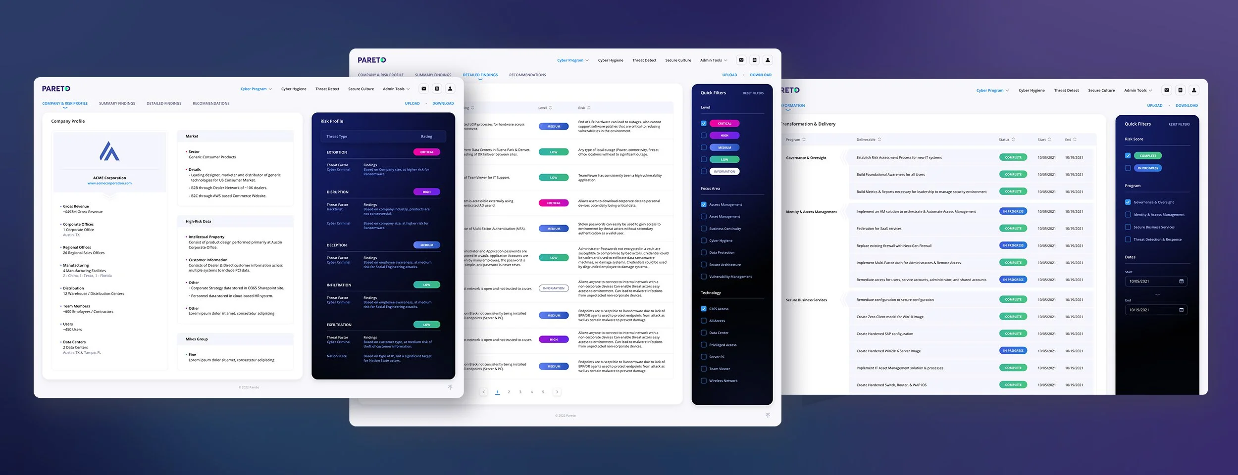 Pareto Cyber, a leader in cyber prevention & defense, contracted The Skins Factory to redesign their secure, scalable, forward-thinking cybersecurity program for mid-market and enterprise. In an effort to forge new ground, our design team broke the paradigm of red, yellow & green and designed an alternative color scheme to denote critical, high, medium and low risks.